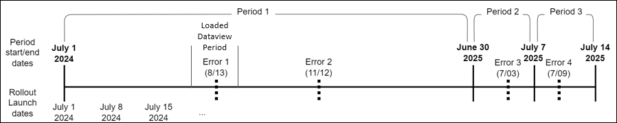 - Rollout Period(s): Dataview pulls in errors in the loaded Dataview period, as well as all other errors that occurred in the rollout event (includes all errors in schedule rollout periods that overlap with the loaded Dataview period).
