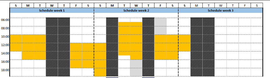 For example, the yellow boxes below represent shifts and the gray boxes represent time off. The shifts for Sunday, Monday and Tuesday all start at 10:00. Then the employee has Wednesday and Thursday off. Because the schedule is stable only within continuous days, the schedule start time changes on Friday, Saturday, and Sunday.
