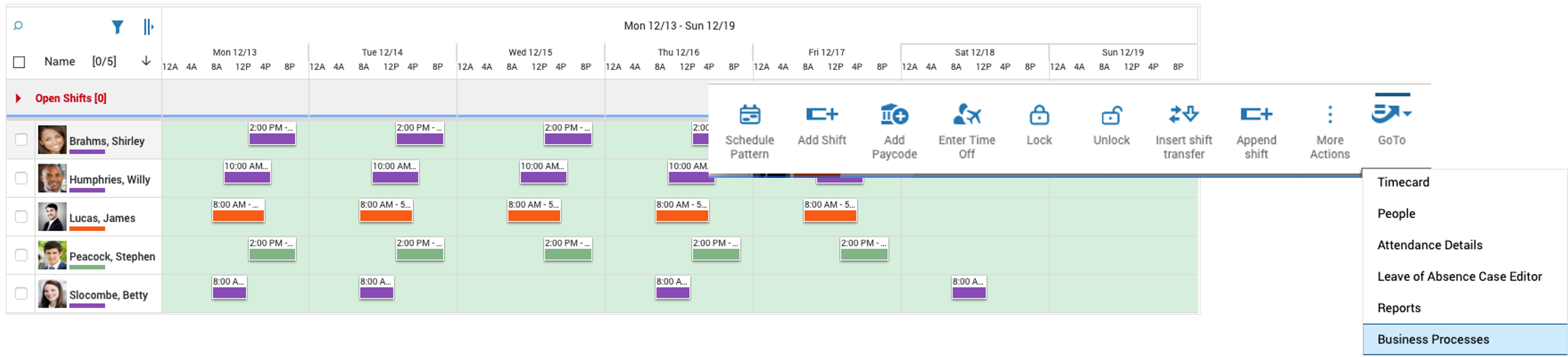 In the Schedule Planner, select the date range, navigate to the GoTo control, and select Business Processes.