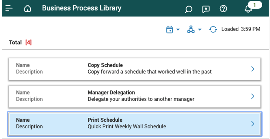 The Print Schedule extension provides a quick and easy way to initiate a print job for a single schedule report directly from the Schedule Planner. Managers with access to reporting must have the preselected report included in their report profile to use this functionality.