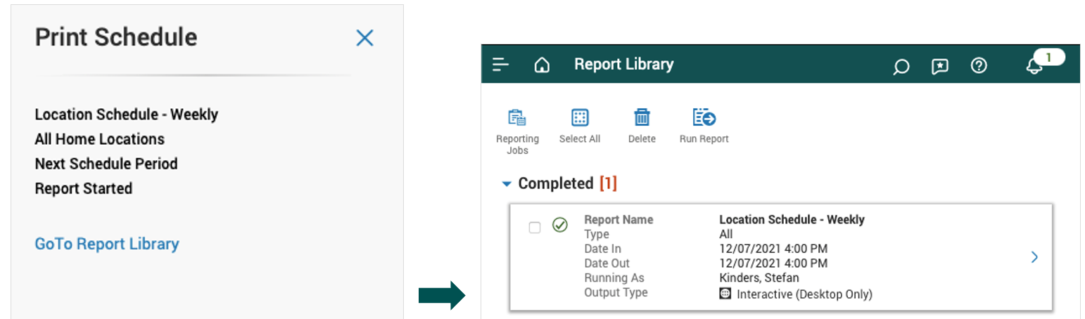 Use the GoTo Report Library link in the Print Schedule box to view the generated report.