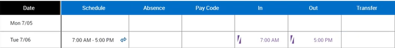 For example, the timecard below shows an employee that works a shift from 7AM-5PM. All shift details appear in the employee’s timecard, including system-generated breaks and transfers.